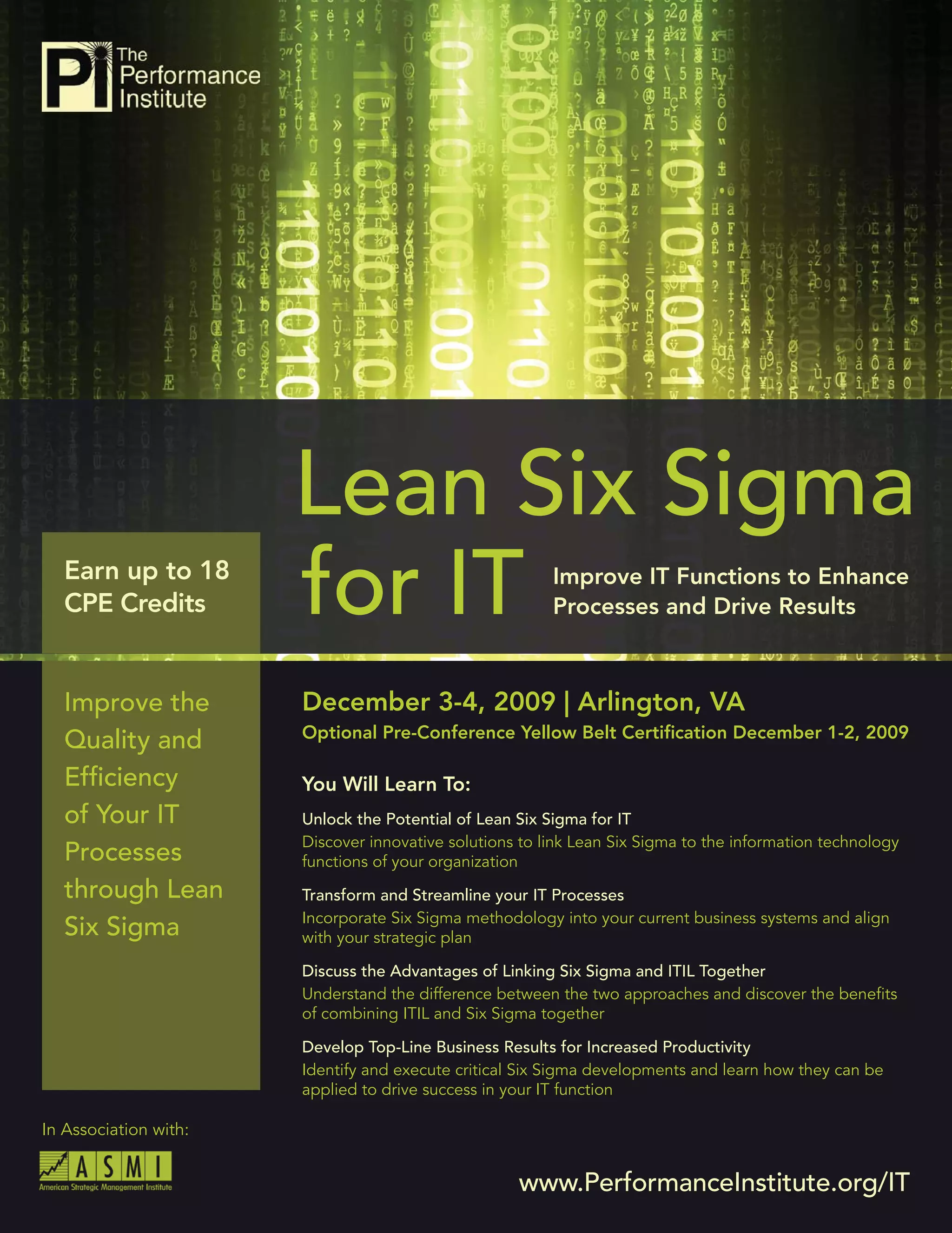 This document provides information about a Lean Six Sigma for IT workshop that will teach attendees how to apply Lean Six Sigma methodology to improve the quality and efficiency of their IT processes. The 2-day workshop will cover the Define, Measure, Analyze, Improve, and Control (DMAIC) process improvement methodology. Attendees will learn techniques to identify improvement opportunities, measure key performance metrics, determine root causes of issues, develop solutions to address problems, and create control plans to maintain gains. On the second day, attendees can earn their Lean Six Sigma Yellow Belt certification by participating in exercises and passing an exam. The workshop aims to provide IT professionals with tools to continuously enhance their work through data-driven problem solving.