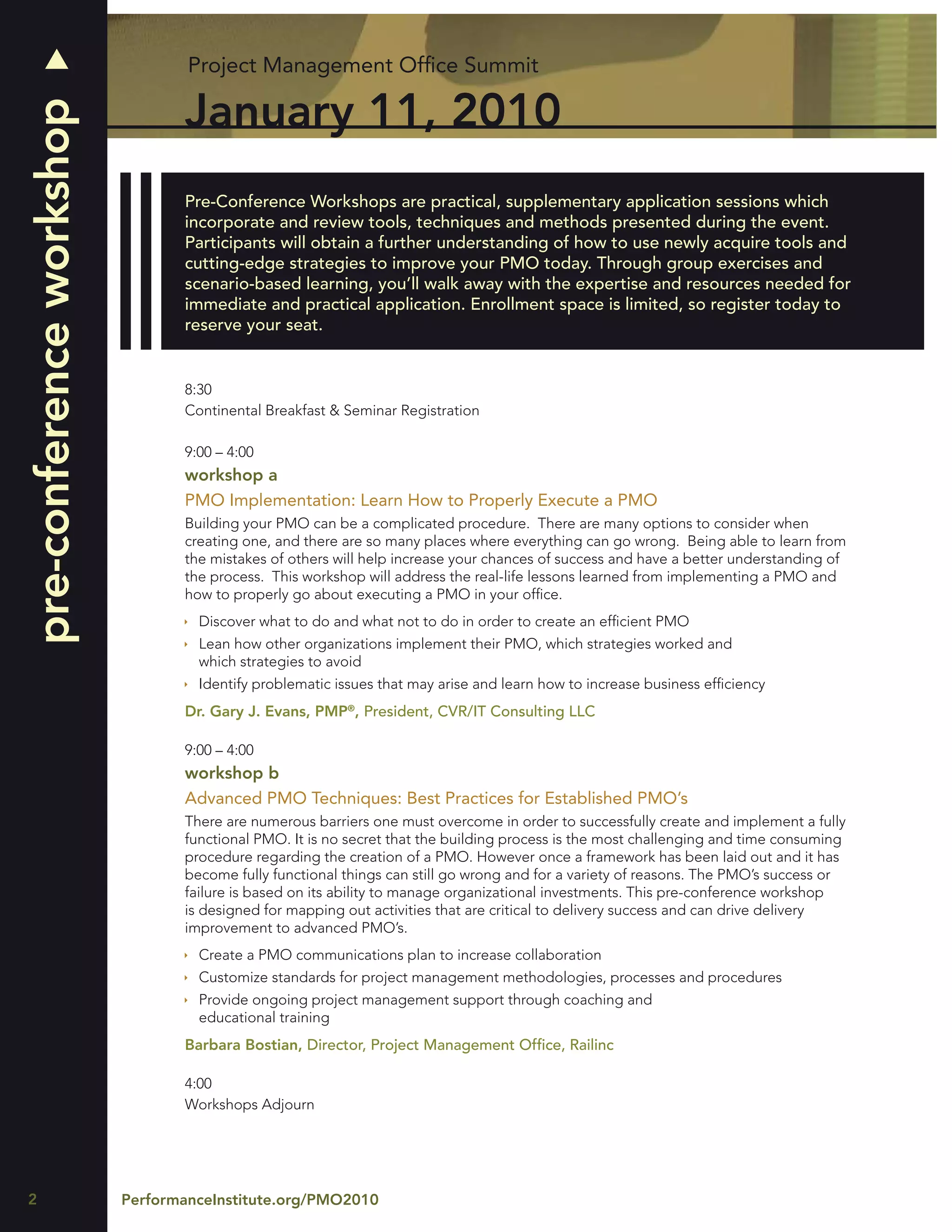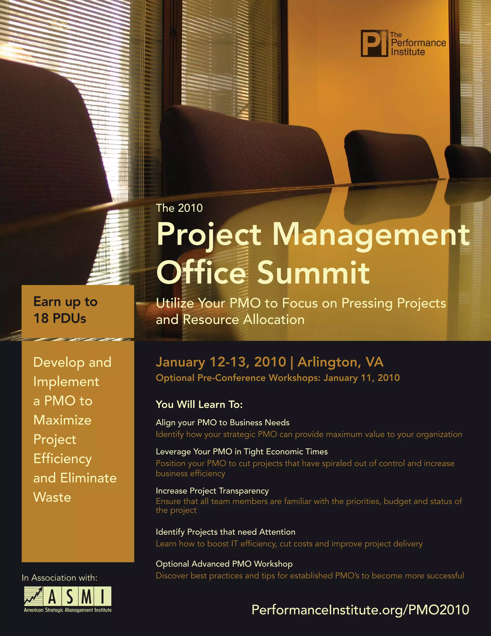 This document provides information about a conference on Project Management Offices (PMOs). The conference will take place January 11-13, 2010 in Arlington, VA and will include keynote speeches, workshops, and sessions on how to implement effective PMOs, align PMOs with business needs, and leverage PMOs to improve project efficiency. Attendees can earn up to 18 professional development units. The document provides an agenda, speaker bios, logistics information, and sponsorship opportunities.