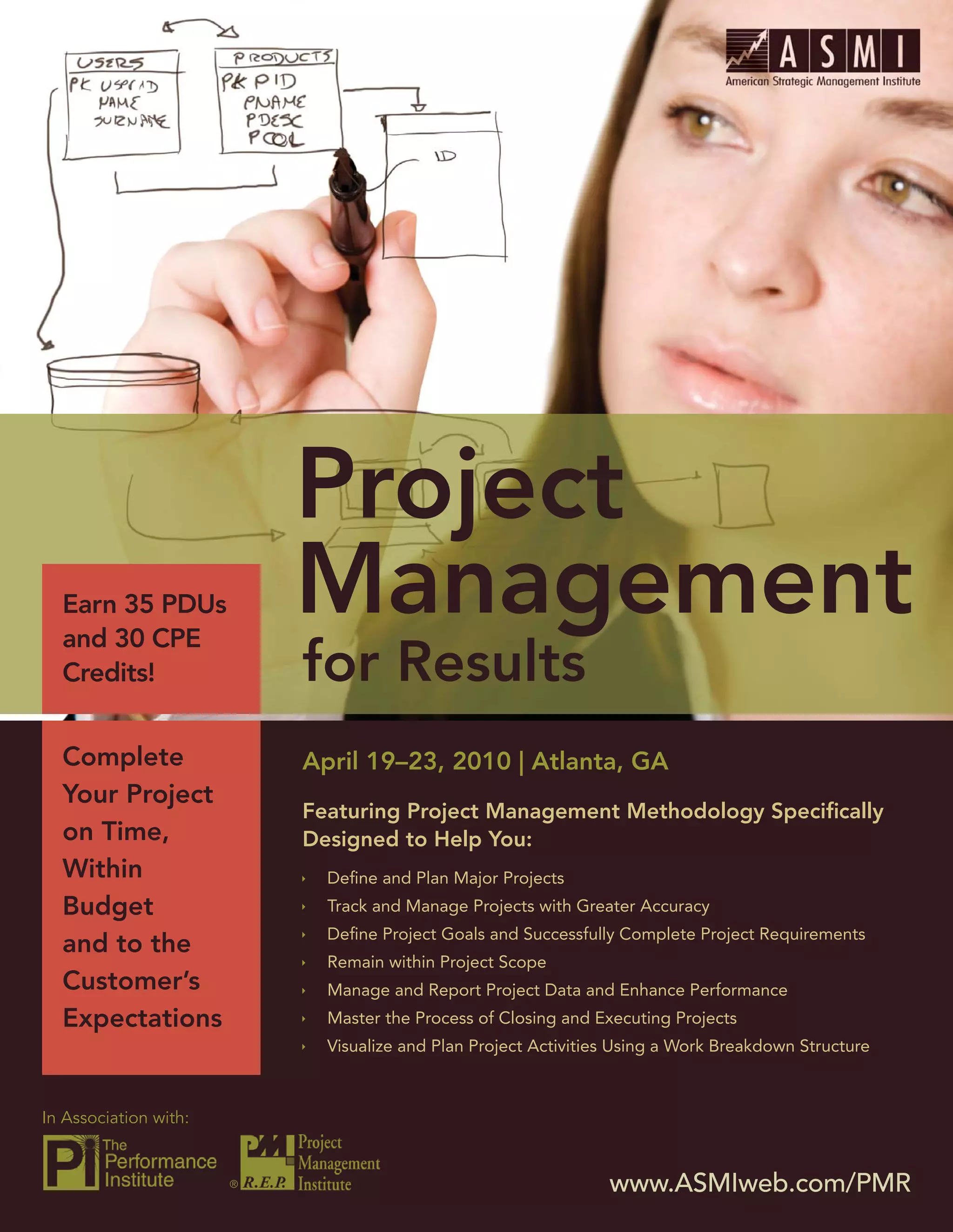 This 5-day training event provides 35 PDUs and 30 CPE credits and teaches the latest project management methodologies according to the PMBOK to help participants define and plan major projects, track and manage projects with greater accuracy, define project goals and successfully complete project requirements, remain within project scope, and manage and report project data and enhance performance. The training covers topics such as project initiation, organization, infrastructure, estimation, scheduling, budgeting, resource management, and project plan optimization. Attendees include project managers, program managers, PMPs, procurement managers, and IT specialists.