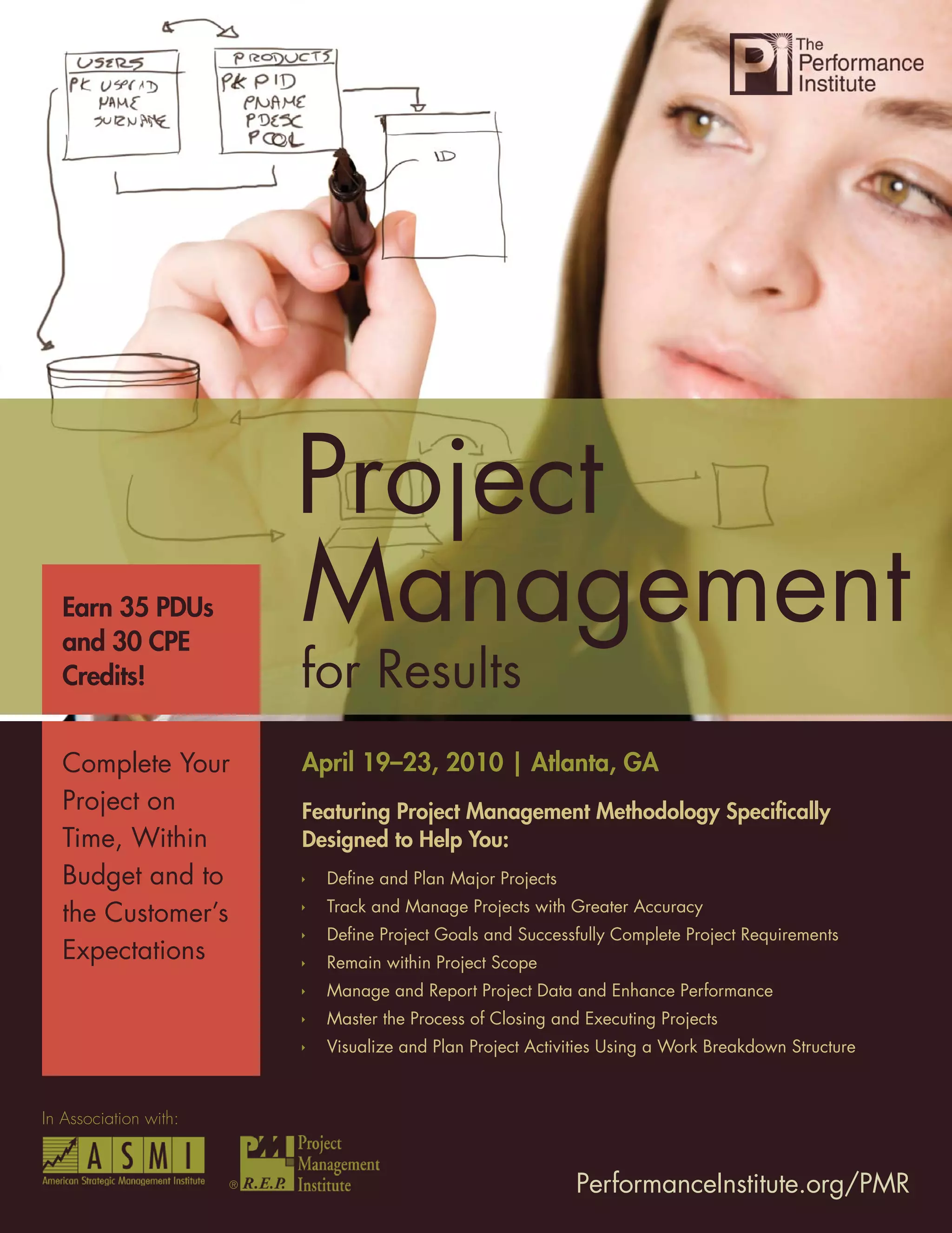 This 5-day training course titled "Project Management for Results" provides 35 PDUs and 30 CPE credits. It will take place from April 19-23, 2010 in Atlanta, GA and teach project managers the latest methodologies according to PMBOK to define, plan, track, and complete projects on time, within budget and to customer expectations. The training will cover key phases and techniques including project initiation, organization, defining requirements and charters, estimating costs using work breakdown structures, developing schedules and budgets, and managing project progress and plans.