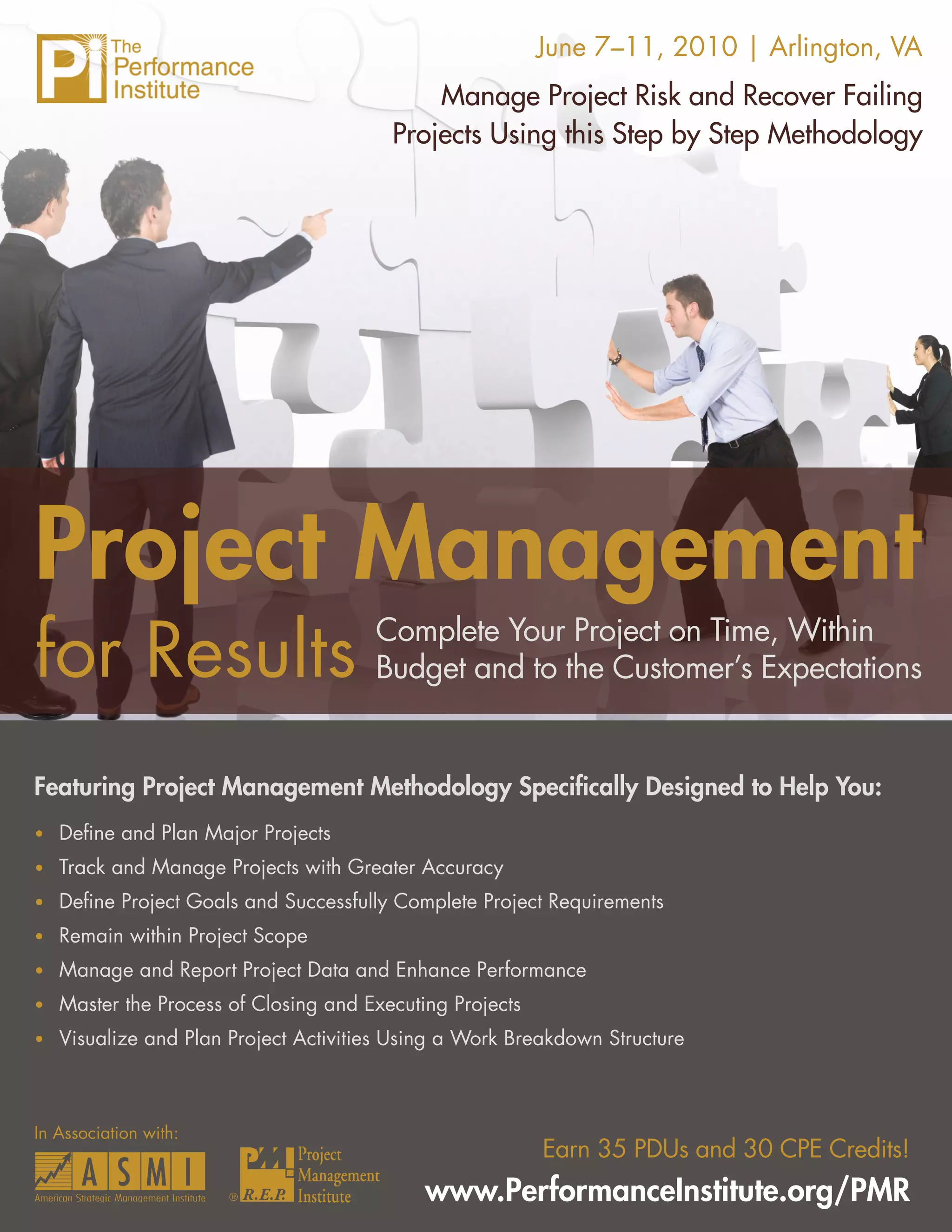 The document describes a 5-day training course on project management methodology. The course will teach techniques for defining projects, planning infrastructure, creating work breakdown structures, developing schedules and budgets, managing project progress, and optimizing plans. Attendees will learn skills for successfully initiating, executing, and completing projects on time and on budget according to customer expectations.