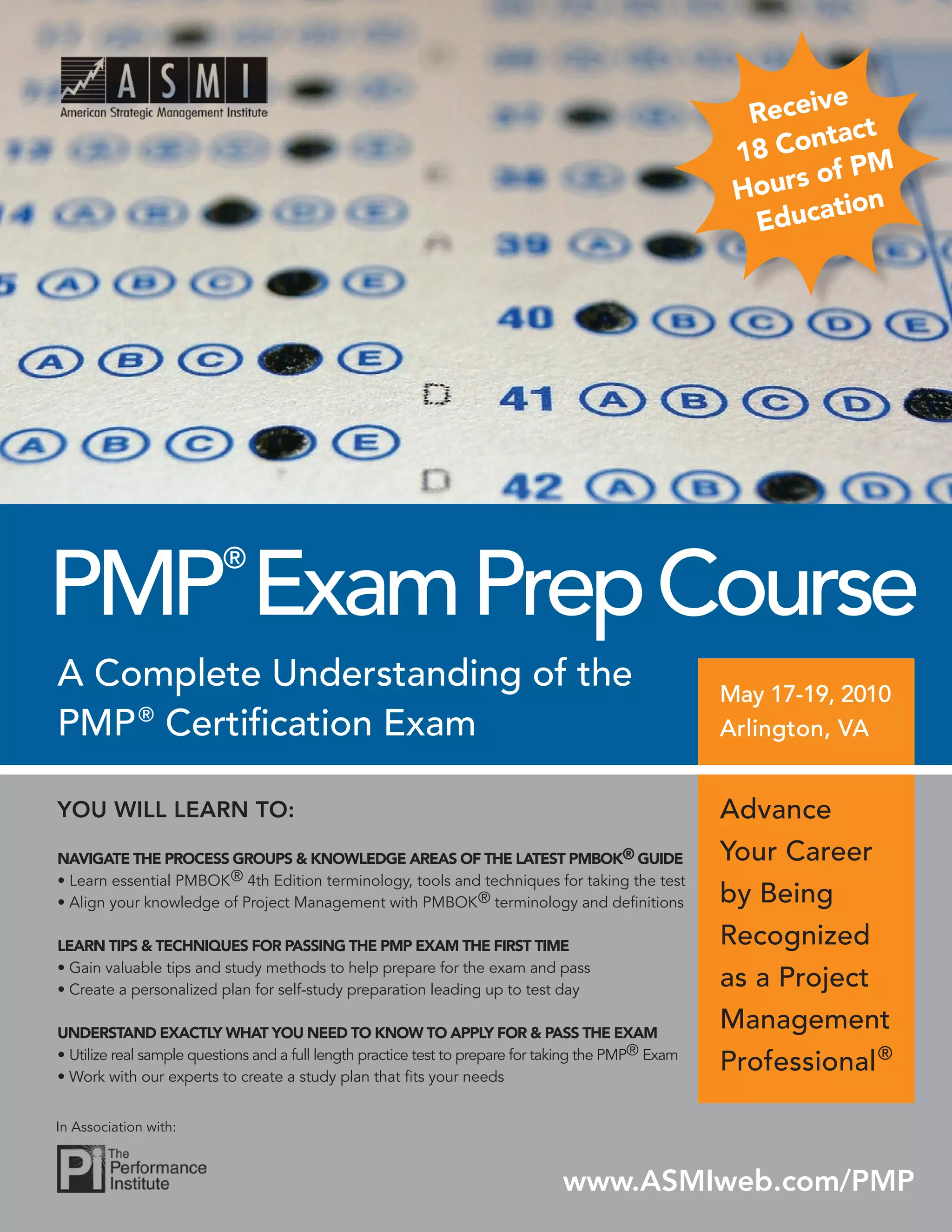 This 3-day training course provides 18 hours of education to help attendees prepare for the Project Management Professional (PMP)® certification exam. The course will cover all nine knowledge areas and five process groups outlined in the Project Management Body of Knowledge (PMBOK)® Guide. Attendees will learn exam tips and techniques, practice sample questions, and create a personalized study plan. The training will take place in Arlington, Virginia from May 17-19, 2010.