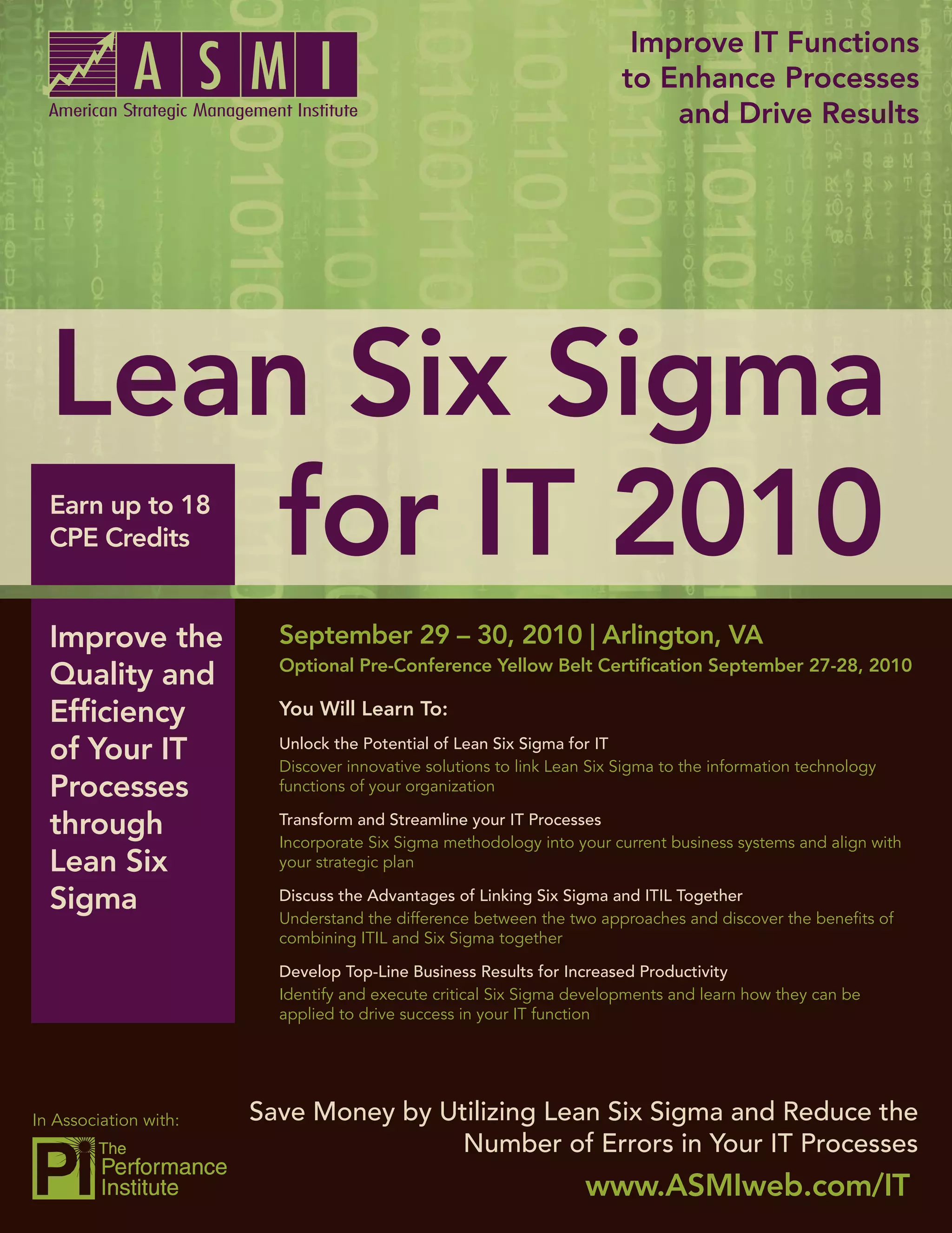 This document provides information about a two-day conference on applying Lean Six Sigma methodology to improve IT processes and functions. The conference will provide an overview of Lean Six Sigma and the DMAIC process, discuss specific case studies, and offer a pre-conference certification option. Sessions will address topics such as change management, process transformation, innovation, and combining Six Sigma with the ITIL framework. Attendees include IT professionals seeking to enhance quality, efficiency and results. CPE credits are offered.
