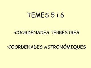 COORDENADES TERRESTRES Pera situar un punt de l’esfera terrestre, utilitzem un sistema de coordenades esfèriques anomenat geogràfic . Per a definir un sistema de coordenades, són necessaris els següents elements: un pla fonamental, un punt fonamental i un sentit per a la mesura d’angles. En el nostre cas, constituiran el nostre sistema de referència el pla de l’equador i un meridià que per acord internacional és el de l’observatori de Greenwich; les coordenades d’aquest sistema són : Longitud .- És l’angle mesurat a l’est o a l’oest del meridià de Greenwich i varia entre 0º i 180º. Latitud .- És l’arc de meridià des de l’equador fins al lloc que volem situar. Variarà entre 0º i 90º si el lloc està al nord de l’equador i entre 0º i -90º si està al sud.