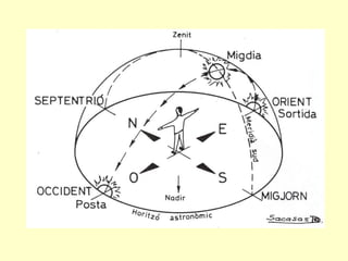 Vertical del lloc.- És un eix que indica la direcció de la gravetat (la mateixa que indica una plomada en un punt de la superfície de la terra). Zenit .- Punt d’intersecció de l’esfera celeste i la vertical del lloc per damunt de l’observador (al meridià superior). Nadir .- Punt d’intersecció de l’esfera celeste i la vertical del lloc per sota de l’observador. Horitzó del lloc .- Cercle màxim perpendicular a la vertical del lloc. Divideix l’esfera celeste en dos hemisferis, el superior o visible i l’inferior o invisible. Meridià del lloc .- És el meridià (cercle màxim que passa pels pols) que conté el zénit i el nadir. Línia Meridiana .- És la intersecció del meridià del lloc amb el pla de l’horitzó. Indica els punts cardinals Nord i Sud. REFERÈNCIES DE L’OBSERVADOR LOCAL