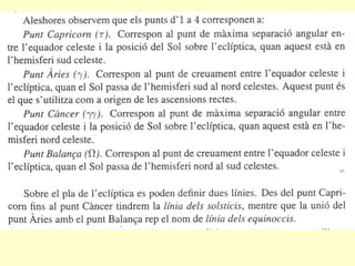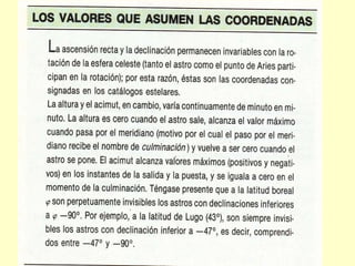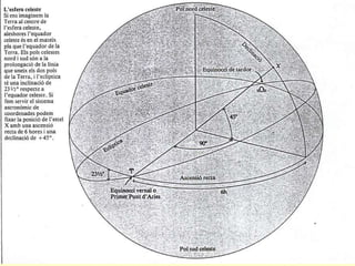 Línies sobre l’esferaceleste . La majoria d’aquestes són la projecció de les línies de l’esfera terrestre sobre l’esfera celeste, d’aquesta forma obtenim: l’ eix celeste l’equador celeste els paral·lels celestes (també anomenats almucantarats ) els meridians celestes .