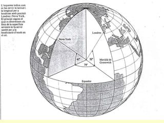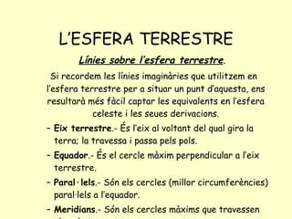 L’ESFERA TERRESTRE Líniessobre l’esfera terrestre . Si recordem les línies imaginàries que utilitzem en l’esfera terrestre per a situar un punt d’aquesta, ens resultarà més fàcil captar les equivalents en l’esfera celeste i les seues derivacions. Eix terrestre .- És l’eix al voltant del qual gira la terra; la travessa i passa pels pols. Equador .- És el cercle màxim perpendicular a l’eix terrestre. Paral·lels .- Són els cercles (millor circumferències) paral·lels a l’equador. Meridians .- Són els cercles màxims que travessen els pols terrestres.