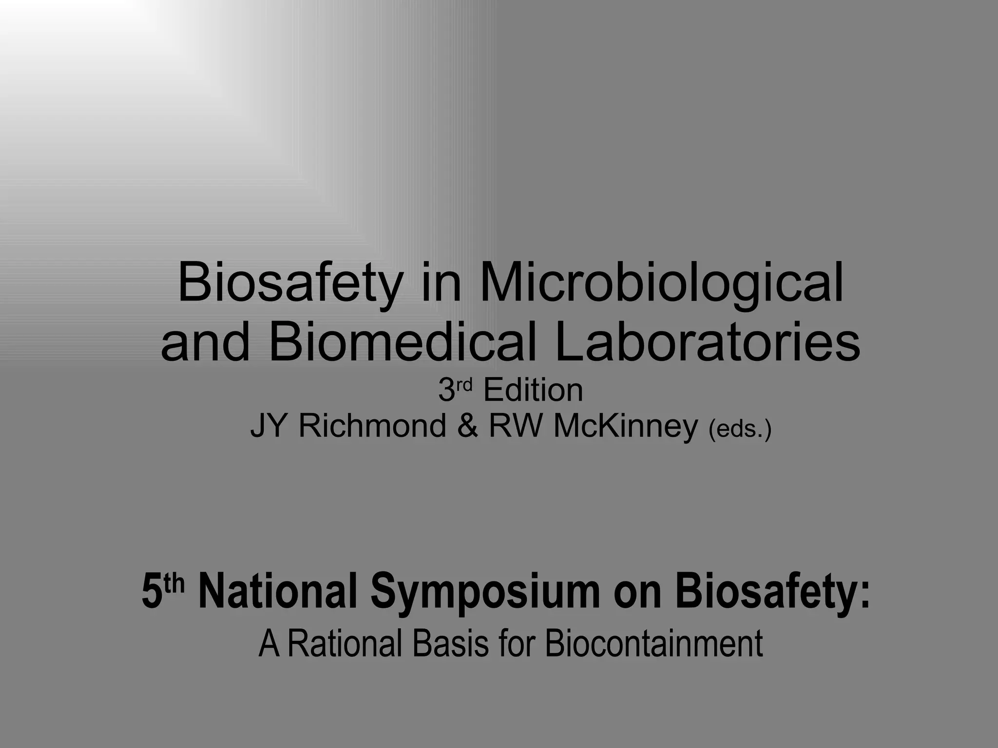 The document discusses biosafety levels and guidelines for working safely in microbiological and biomedical laboratories. It notes that between 1941-1949 there were over 3,000 laboratory-associated infections reported in the US, with hepatitis, brucellosis, tuberculosis, and tularemia among the most commonly reported. Biosafety levels 1-3 provide increasing levels of personnel and environmental protection, with guidelines for laboratory practices, safety equipment, and facilities appropriate for each level. Biosafety level 1 is suitable for agents not known to cause disease in healthy adults and pose minimal risk.