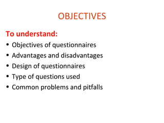 A well-designed questionnaire should be short, simple, and focused. It should minimize bias and maximize responses to accurately answer the research question. Key aspects of design include using closed-ended questions, clearly worded items, and an order that moves from easy to difficult questions. Piloting is important to identify and address any issues before widespread distribution.