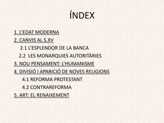 ÍNDEX 1. L’EDAT MODERNA 2.CANVIS AL S.XV 2.1 L’ESPLENDOR DE LA BANCA 2.2 LES MONARQUIES AUTORITÀRIES 3. NOU PENSAMENT: L’HUMANISME 4. DIVISIÓ I APARICIÓ DE NOVES RELIGIONS 4.1 REFORMA PROTESTANT 4.2 CONTRAREFORMA 5. ART: EL RENAIXEMENT