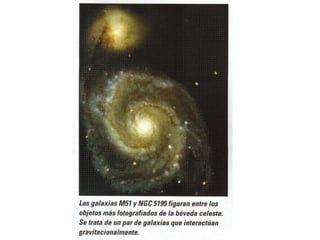 M81 i M82:una cita còsmica M81 - Galàxia de Bode Distància: 12 milions a-l. Magnitud: 6’9 Tipus: espiral Sb Encontre amb M82: fa algunes desenes de milions d’anys. Conseqüència: gran deformació d’M82 i distorsió d’M81 (la banda negra a la part inferior del nucli). No conté gaire massa fosca a l’halo (contràriament al cas de la Via Làctia ).