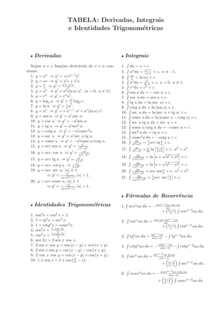 TABELA: Derivadas, Integrais
