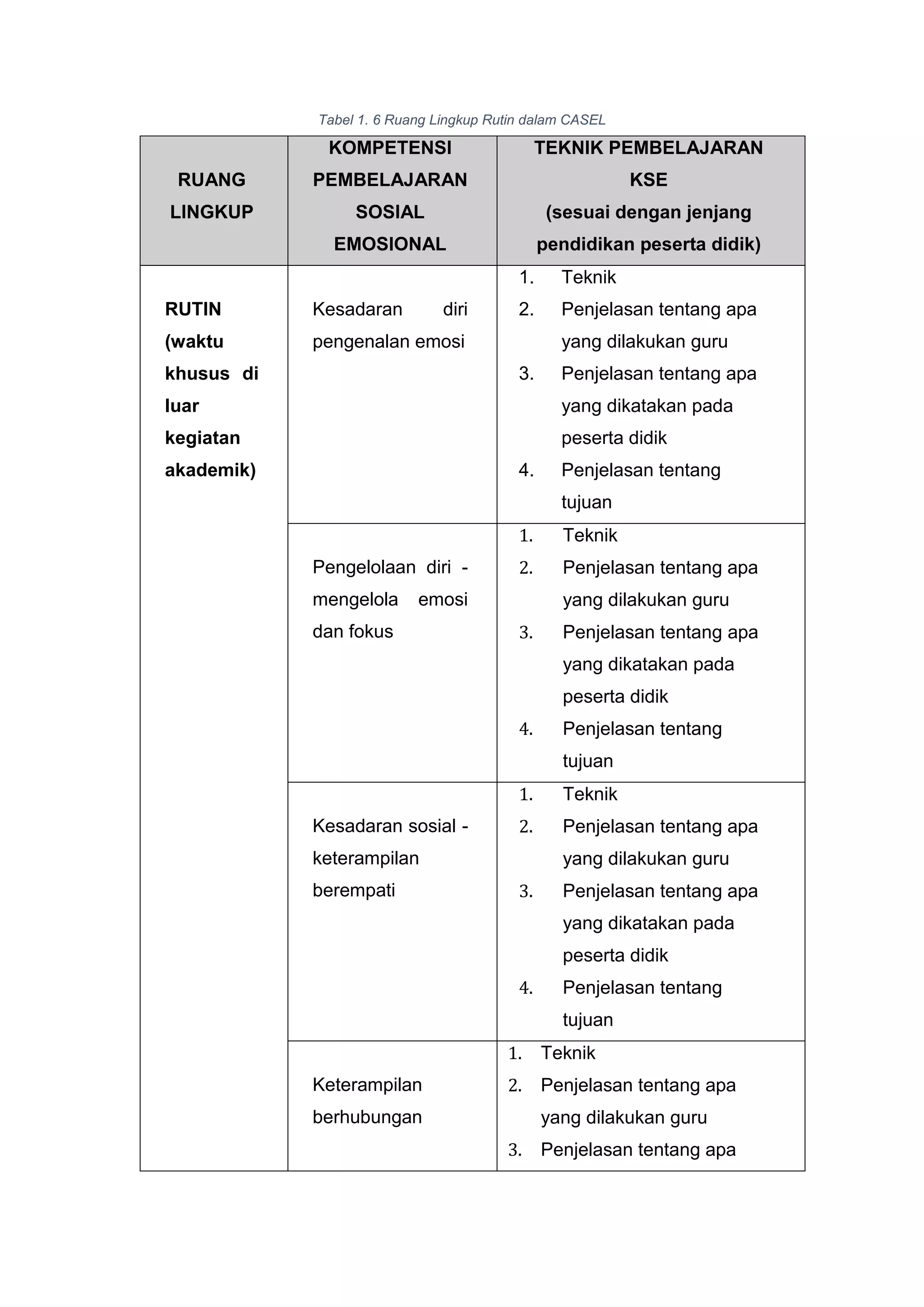 Tabel 1 menunjukkan 7 ruang lingkup pembelajaran keterampilan sosial emosional (KSE) menurut CASEL yaitu rutin, terintegrasi dalam mata pelajaran, dan protokol yang mencakup kesadaran diri, pengelolaan diri, kesadaran sosial, keterampilan berhubungan sosial, dan pengambilan keputusan serta teknik pembelajaran KSE.