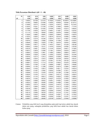 t (df = 1 – 40) Pr 0.25 0.10 0.05 0.025 0.01 0.005 0.001 df 0.50 0.20 0.10 0.050 0.02 0.010 0.002 1 1.00000 3.07768 6.31375 12.70620 31.82052 63.65674 318.30884 2 0.81650 1.88562 2.91999 4.30265 6.96456 9.92484 22.32712 3 0.76489 1.63774 2.35336 3.18245 4.54070 5.84091 10.21453 4 0.74070 1.53321 2.13185 2.77645 3.74695 4.60409 7.17318 5 0.72669 1.47588 2.01505 2.57058 3.36493 4.03214 5.89343 6 0.71756 1.43976 1.94318 2.44691 3.14267 3.70743 5.20763 7 0.71114 1.41492 1.89458 2.36462 2.99795 3.49948 4.78529 8 0.70639 1.39682 1.85955 2.30600 2.89646 3.35539 4.50079 9 0.70272 1.38303 1.83311 2.26216 2.82144 3.24984 4.29681 10 0.69981 1.37218 1.81246 2.22814 2.76377 3.16927 4.14370 11 0.69745 1.36343 1.79588 2.20099 2.71808 3.10581 4.02470 12 0.69548 1.35622 1.78229 2.17881 2.68100 3.05454 3.92963 13 0.69383 1.35017 1.77093 2.16037 2.65031 3.01228 3.85198 14 0.69242 1.34503 1.76131 2.14479 2.62449 2.97684 3.78739 15 0.69120 1.34061 1.75305 2.13145 2.60248 2.94671 3.73283 16 0.69013 1.33676 1.74588 2.11991 2.58349 2.92078 3.68615 17 0.68920 1.33338 1.73961 2.10982 2.56693 2.89823 3.64577 18 0.68836 1.33039 1.73406 2.10092 2.55238 2.87844 3.61048 19 0.68762 1.32773 1.72913 2.09302 2.53948 2.86093 3.57940 20 0.68695 1.32534 1.72472 2.08596 2.52798 2.84534 3.55181 21 0.68635 1.32319 1.72074 2.07961 2.51765 2.83136 3.52715 22 0.68581 1.32124 1.71714 2.07387 2.50832 2.81876 3.50499 23 0.68531 1.31946 1.71387 2.06866 2.49987 2.80734 3.48496 24 0.68485 1.31784 1.71088 2.06390 2.49216 2.79694 3.46678 25 0.68443 1.31635 1.70814 2.05954 2.48511 2.78744 3.45019 26 0.68404 1.31497 1.70562 2.05553 2.47863 2.77871 3.43500 27 0.68368 1.31370 1.70329 2.05183 2.47266 2.77068 3.42103 28 0.68335 1.31253 1.70113 2.04841 2.46714 2.76326 3.40816 29 0.68304 1.31143 1.69913 2.04523 2.46202 2.75639 3.39624 30 0.68276 1.31042 1.69726 2.04227 2.45726 2.75000 3.38518 31 0.68249 1.30946 1.69552 2.03951 2.45282 2.74404 3.37490 32 0.68223 1.30857 1.69389 2.03693 2.44868 2.73848 3.36531 33 0.68200 1.30774 1.69236 2.03452 2.44479 2.73328 3.35634 34 0.68177 1.30695 1.69092 2.03224 2.44115 2.72839 3.34793 35 0.68156 1.30621 1.68957 2.03011 2.43772 2.72381 3.34005 36 0.68137 1.30551 1.68830 2.02809 2.43449 2.71948 3.33262 37 0.68118 1.30485 1.68709 2.02619 2.43145 2.71541 3.32563 38 0.68100 1.30423 1.68595 2.02439 2.42857 2.71156 3.31903 39 0.68083 1.30364 1.68488 2.02269 2.42584 2.70791 3.31279 40 0.68067 1.30308 1.68385 2.02108 2.42326 2.70446 3.30688 Catatan: Probabilita yang lebih kecil yang ditunjukkan pada judul tiap kolom adalah luas daerah dalam satu ujung, sedangkan probabilitas yang lebih besar adalah luas daerah dalam kedua ujung Diproduksi oleh: Junaidi (http://junaidichaniago.wordpress.com), 2010 Page 1