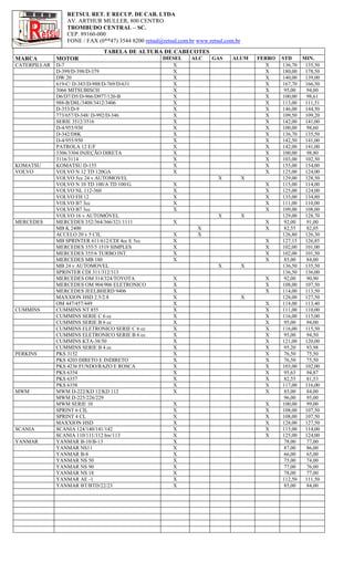 This document is a table providing height specifications for engine heads from various vehicle manufacturers. It lists manufacturer, model, fuel type, materials, standard height, and minimum height for over 100 engine models from brands like Peugeot, Renault, Toyota, Kia, Hyundai, Mitsubishi, Honda, BMW, Suzuki, Audi, Jeep, Nissan, Citroen, Mazda, Caterpillar, Komatsu, Volvo, Mercedes, Cummins, Perkins, MWM, Scania, Yanmar, GM, and others. The specifications range from 45mm to 180mm and cover gasoline, diesel, LPG, and other fuel types along with various head materials.