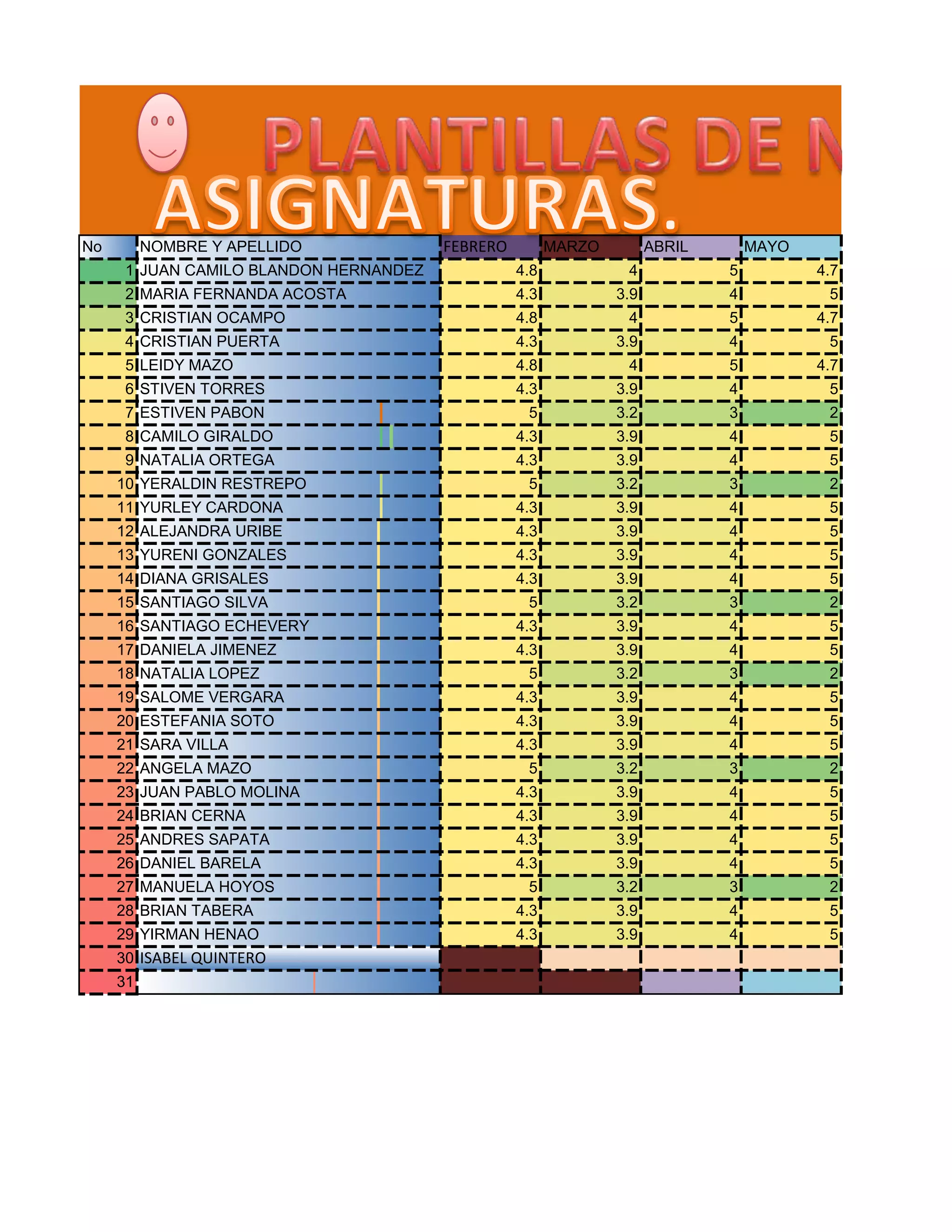 The document contains the monthly grades from February to November of 31 students. It lists the students' names, grades for each month, and their final average. The grades range from 3 to 5, with most students receiving consistent grades throughout the year except for a few who scored lower in some months.