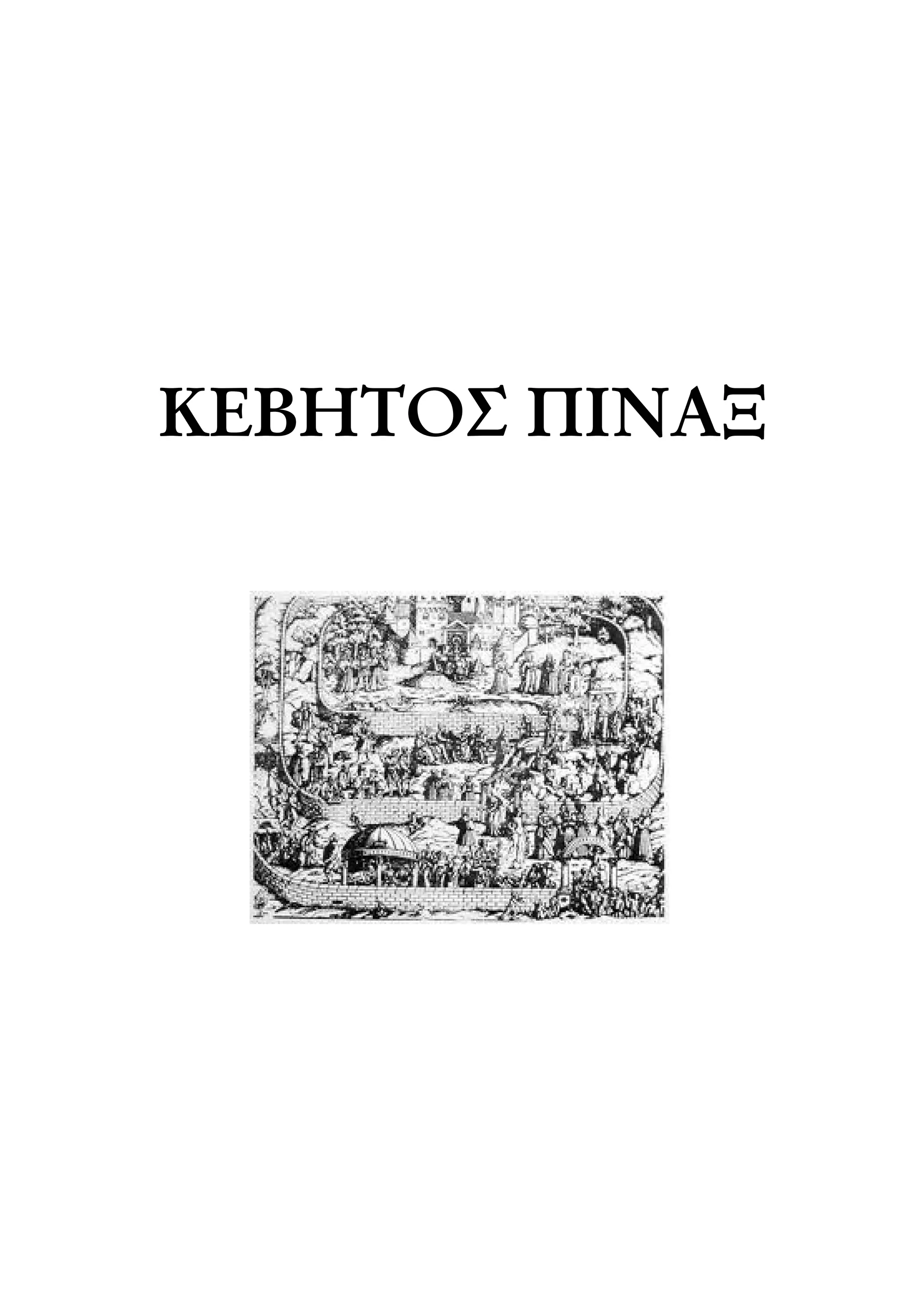 τοίνυν διηγούμενος ὡς ἡμῶν προσεξόντων οὐ παρέργως, ἐπείπερ καὶ τὸ ἐπιτίμιον τοιοῦτόν ἐστιν. Ἀναλαβὼν οὖν ῥάβδον τινὰ καὶ ἐκτείνας πρὸς τὴν γραφήν, Ὁρᾶτε, ἔφη, τὸν περίβολον τοῦτον; Ὁρῶμεν. Τοῦτο πρῶτον δεῖ εἰδέναι ὑμᾶς, ὅτι καλεῖται οὗτος ὁ τόπος Βίος. καὶ ὁ ὄχλος ὁ πολὺς ὁ παρὰ τὴν πύλην ἐφεστὼς οἱ μέλλοντες εἰσπορεύεσθαι εἰς τὸν Βίον οὗτοί εἰσιν. ὁ δὲ γέρων ὁ ἄνω ἑστηκὼς ἔχων χάρτην τινὰ ἐν τῇ χειρὶ καὶ τῇ ἑτέρᾳ ὥσπερ δεικνύων τι, οὗτος ∆αίμων καλεῖται· προστάττει δὲ τοῖς εἰσπορευομένοις, τί δεῖ αὐτοὺς ποιεῖν, ὡς ἂν εἰσέλθωσιν εἰς τὸν Βίον· δεικνύει δὲ ποίαν ὁδὸν αὐτοὺς δεῖ βαδίζειν, εἰ μέλλουσι σώζεσθαι ἐν τῷ Βίῳ. 5. Ποίαν οὖν ὁδὸν κελεύει βαδίζειν ἢ πῶς; ἔφην ἐγώ. Ὁρᾷς οὖν, εἶπε, παρὰ τὴν πύλην θρόνον τινὰ κεί- μενον κατὰ τὸν τόπον, καθ' ὃν εἰσπορεύεται ὁ ὄχλος, ἐφ' οὗ κάθηται γυνὴ πεπλασμένη τῷ ἤθει καὶ πιθανὴ φαινομένη, ἣ ἐν τῇ χειρὶ ἔχει ποτήριόν τι; Ὁρῶ. ἀλλὰ τίς ἐστιν αὕτη; ἔφην. 6