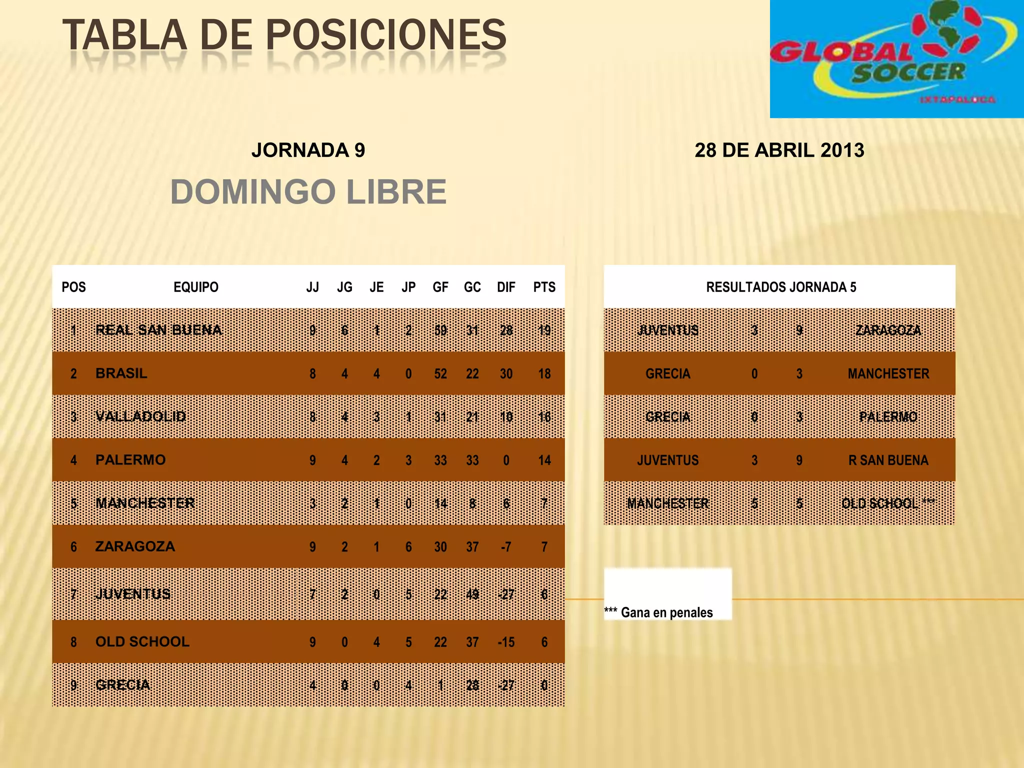 The document is a table summarizing the standings from matchday 9 of a soccer league. It shows the top 9 teams ranked by points, with their number of games played, won, drawn, lost, goals for, goals against, goal difference, and points. In 1st place is Real San Buena with 19 points from 9 games played. In 2nd is Brasil with 18 points from 8 games. Manchester United is in 5th place with 7 points from 3 games.