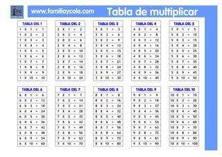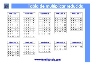 The document contains a reduced multiplication table listing the multiplication facts from 1 x 1 to 10 x 10. It is formatted with the factor on the left ("TABLA DEL"), and the resulting products in a table layout for easy reference of the fundamental multiplication facts.