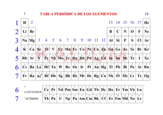 This document is the periodic table of elements in Spanish. It contains 118 elements arranged in blocks by their atomic number. The first block contains the first 18 elements including hydrogen, helium, lithium, beryllium, boron, carbon, nitrogen, oxygen, fluorine, neon and others. Below that are additional blocks containing the remaining 100 elements such as calcium, scandium, titanium, vanadium and others up to oganesson. Within the periodic table, the lanthanide and actinide series of elements are designated with symbols.