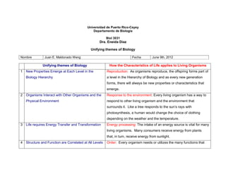 This document provides a summary of the eight unifying themes of biology according to a biology class at Universidad de Puerto Rico-Cayey. It lists each theme and provides a brief example of how that theme applies to living organisms. The themes discussed are: 1) New properties emerge at each level of the biology hierarchy. 2) Organisms interact with their environment and each other. 3) Life requires energy transfer and transformation. 4) Structure and function are correlated at all levels of biological organization. 5) The cell is the basic unit of structure and function of organisms. 6) Continuity of life is based on heritable information in DNA. 7) Feedback mechanisms regulate biological systems. 8)