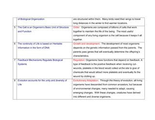 This document provides a summary of the eight unifying themes of biology according to a biology class at Universidad de Puerto Rico-Cayey. It lists each theme and provides a brief example of how that theme applies to living organisms. The themes discussed are: 1) New properties emerge at each level of the biology hierarchy. 2) Organisms interact with their environment and each other. 3) Life requires energy transfer and transformation. 4) Structure and function are correlated at all levels of biological organization. 5) The cell is the basic unit of structure and function of organisms. 6) Continuity of life is based on heritable information in DNA. 7) Feedback mechanisms regulate biological systems. 8)