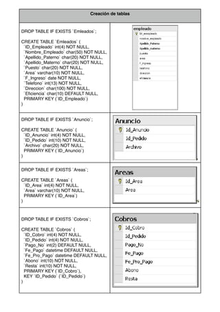 The document describes the creation of multiple database tables to store employee, order, payment, and other related business data. Tables are created for employees, orders, payments, clients, products, and other entities. Data is then inserted into these tables to populate them with sample records.