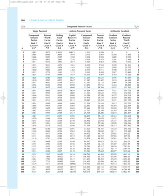 This document contains tables of compound interest factors for interest rates of 1/4%, 1/2%, and 3/4% compounded annually. The tables show the factors needed to calculate future and present values of single payments, uniform series payments, and arithmetic gradient series payments over a range of time periods from 1 to 480 years.
