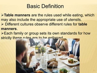 The document outlines the various table manners and etiquette practices, which can differ significantly across cultures and settings. It covers formal and informal table settings, rules for eating, the appropriate use of utensils, and essential etiquette tips to enhance dining experiences. It emphasizes the importance of observing proper behavior, such as placing napkins correctly and waiting for everyone to be served before eating.