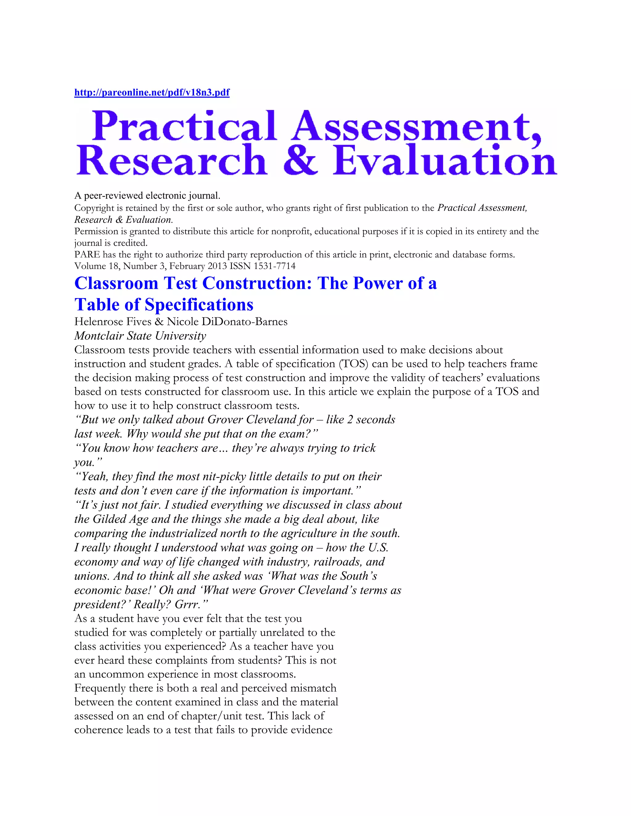 The document provides guidance on developing and using a table of specifications (TOS) to help teachers construct valid classroom tests. A TOS helps ensure tests are aligned to instruction by mapping objectives, time spent on each objective, and cognitive level taught to the number and type of test items. It provides evidence that tests accurately measure the intended content and require similar levels of thinking to what was taught. The document explains how to create a sample TOS and use it to determine the proportion of test items devoted to each objective based on class time. An effective TOS can improve the validity of inferences made from classroom tests.