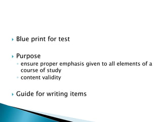 The document provides guidance for writing test items and creating a table of specification. It explains that a table of specification is a two-way chart that describes the topics to be covered on a test and the number of items or points associated with each topic, to ensure all elements of a course of study are properly assessed. It also defines different levels of thinking skills - knowledge, comprehension, application, analysis, synthesis, and evaluation.