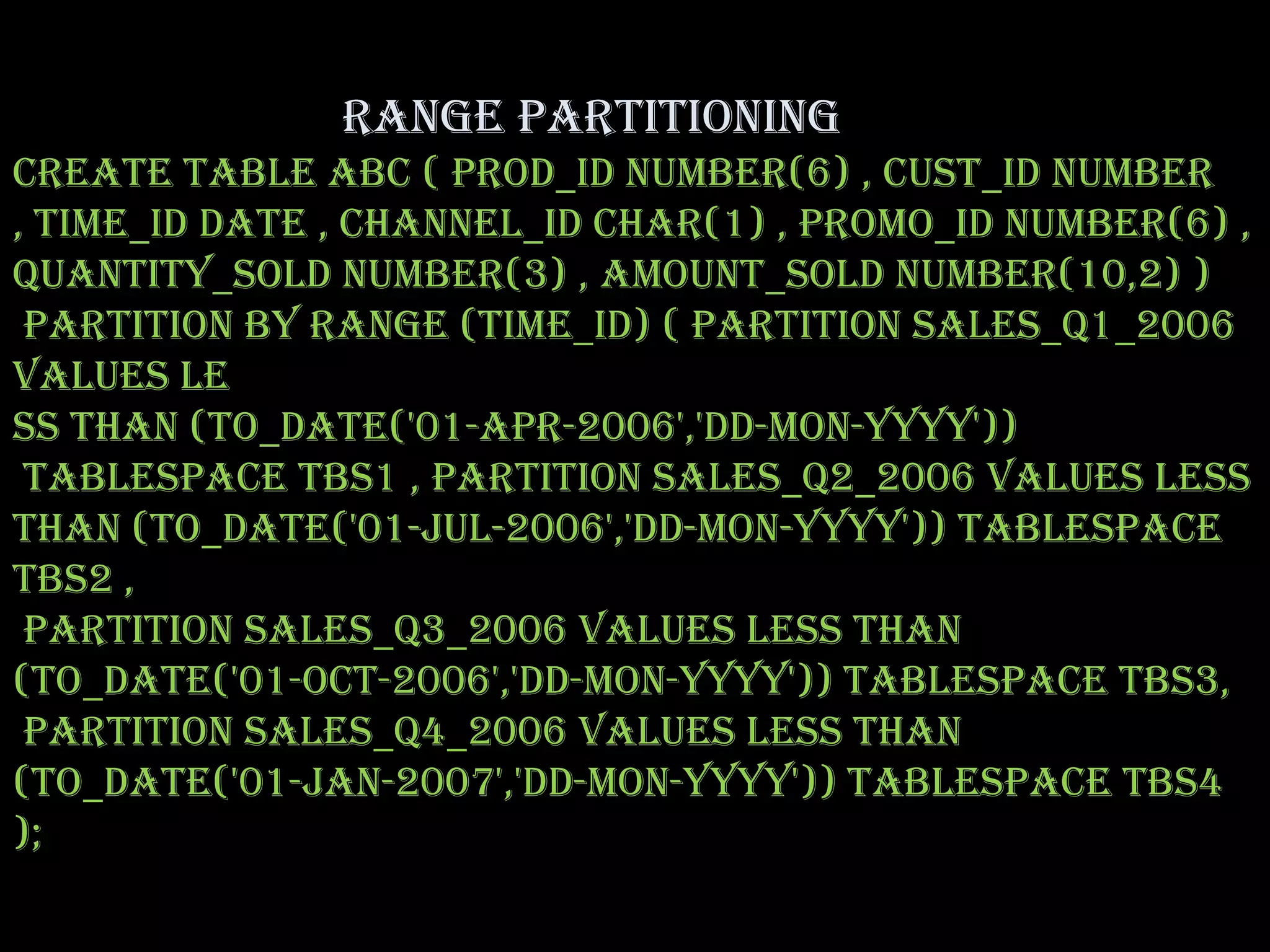 The document describes different types of partitioning that can be used when creating tables in Oracle including range, list, hash, range-hash, range-list, index organized tables, and clustered tables. Examples are provided for each type of partitioning that show the SQL syntax for creating tables using that partitioning method.