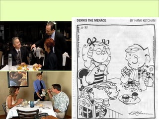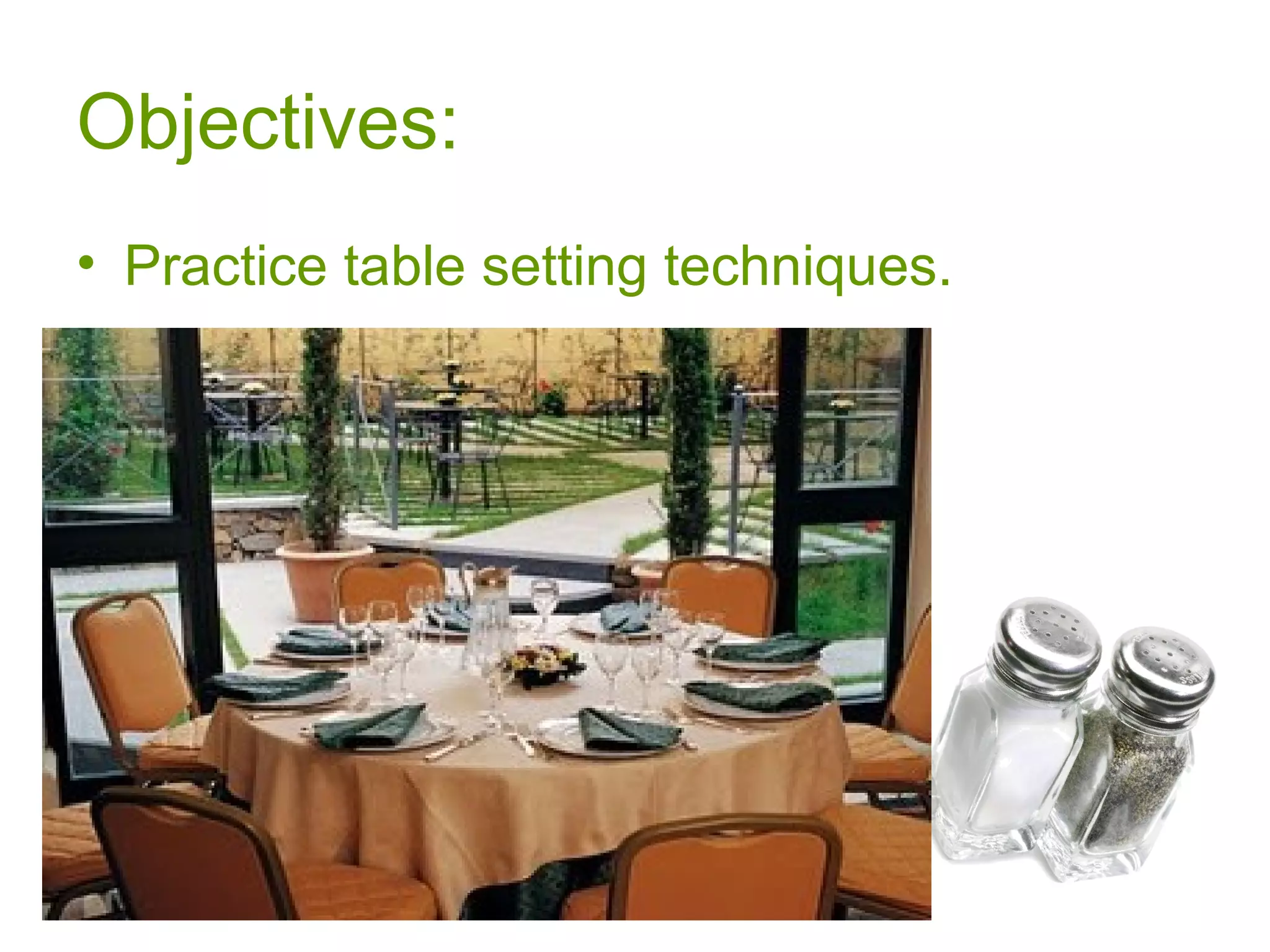 The document outlines the basic principles of table setting including the three components of a place setting (dinnerware, flatware, and glassware). It describes how to properly arrange each item according to 6 rules for dinnerware and 4 rules for flatware placement. Glassware should be placed at the tip of the knife blade or slightly forward. The napkin can be placed in various positions so as not to disturb other items. Following basic table setting and serving techniques can enhance relationships and create a pleasant atmosphere for communication at the table.