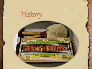 Table tennis originated in Victorian England in the late 19th century as an after-dinner parlor game. It evolved from various earlier indoor tennis games and came to be known as "ping-pong" in the 1890s due to the sound the ball makes during play. The sport organized internationally in the early 20th century with standardized equipment and rules. Table tennis grew rapidly in popularity and became an Olympic sport in 1988.