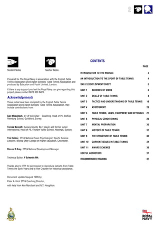 This document provides teaching resources for a table tennis module, including 11 units covering various aspects of the sport. It includes introductions to table tennis skills, tactics, training, rules, history, structure and current issues. It provides sample lesson plans and schemes of work to teach table tennis over 12 lessons, progressively building skills from basic grips and strokes to tactics and gameplay. It aims to give teachers guidelines to help students fulfill examination requirements while gaining an understanding and appreciation of table tennis.