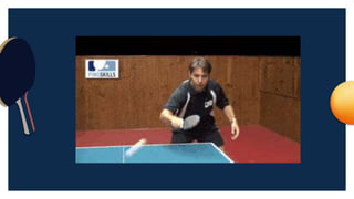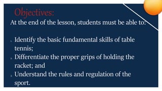 The document summarizes table tennis, including its history, objectives, fundamental skills, and rules. It was invented in Victorian England in 1880 as an adaptation of lawn tennis played on a stationary table. The objectives are to identify basic skills like grips and stances, differentiate proper grips, and understand rules. Key fundamental skills discussed include forehand and backhand drives along with the smash shot.