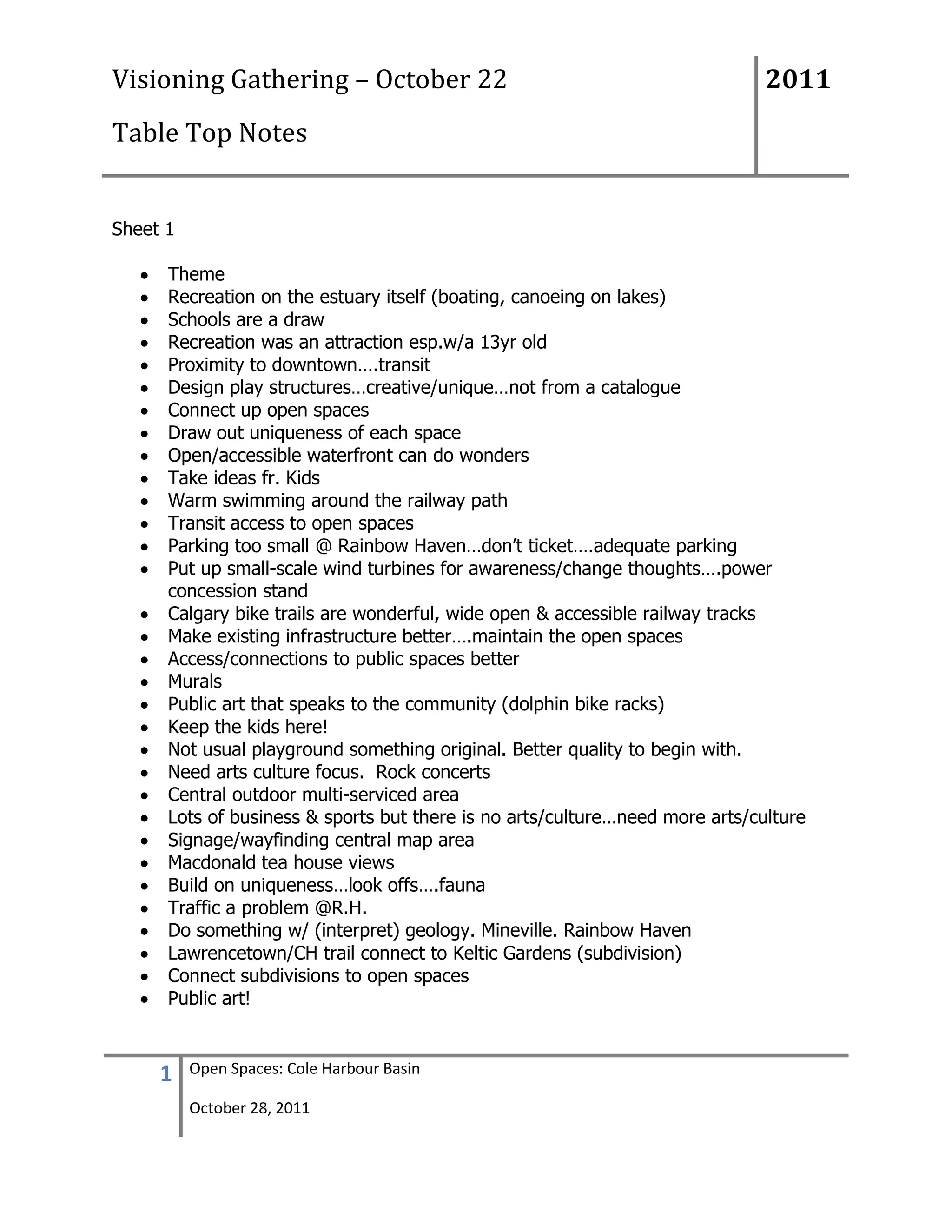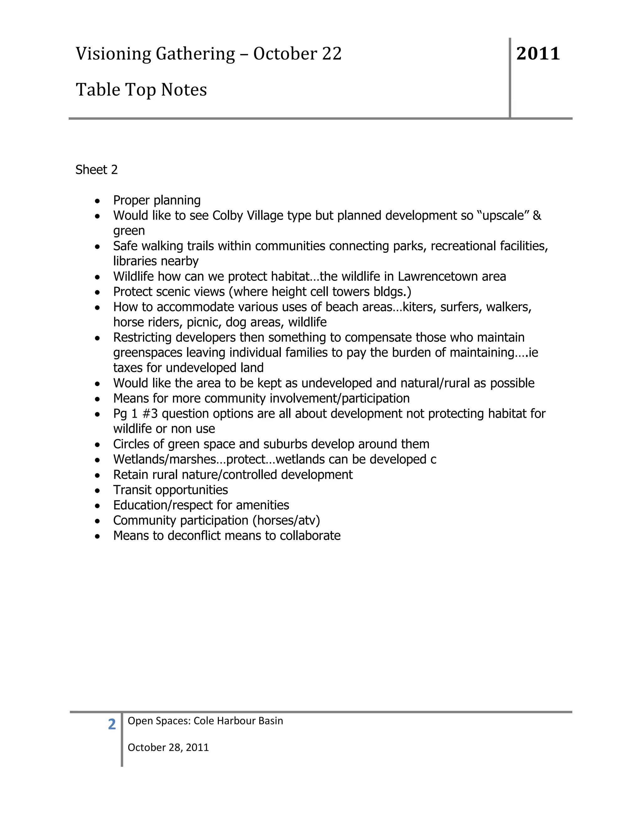 The document summarizes discussions from a visioning gathering regarding open spaces in Cole Harbour. Some key themes discussed include: preserving and enhancing recreation opportunities on the estuary and lakes; improving trail connections between open spaces; ensuring adequate parking and transit access to spaces; protecting natural habitats and scenic views; promoting arts, culture, and community events; and balancing development with preservation of the rural character. Maintaining existing spaces and involving the community were also emphasized.