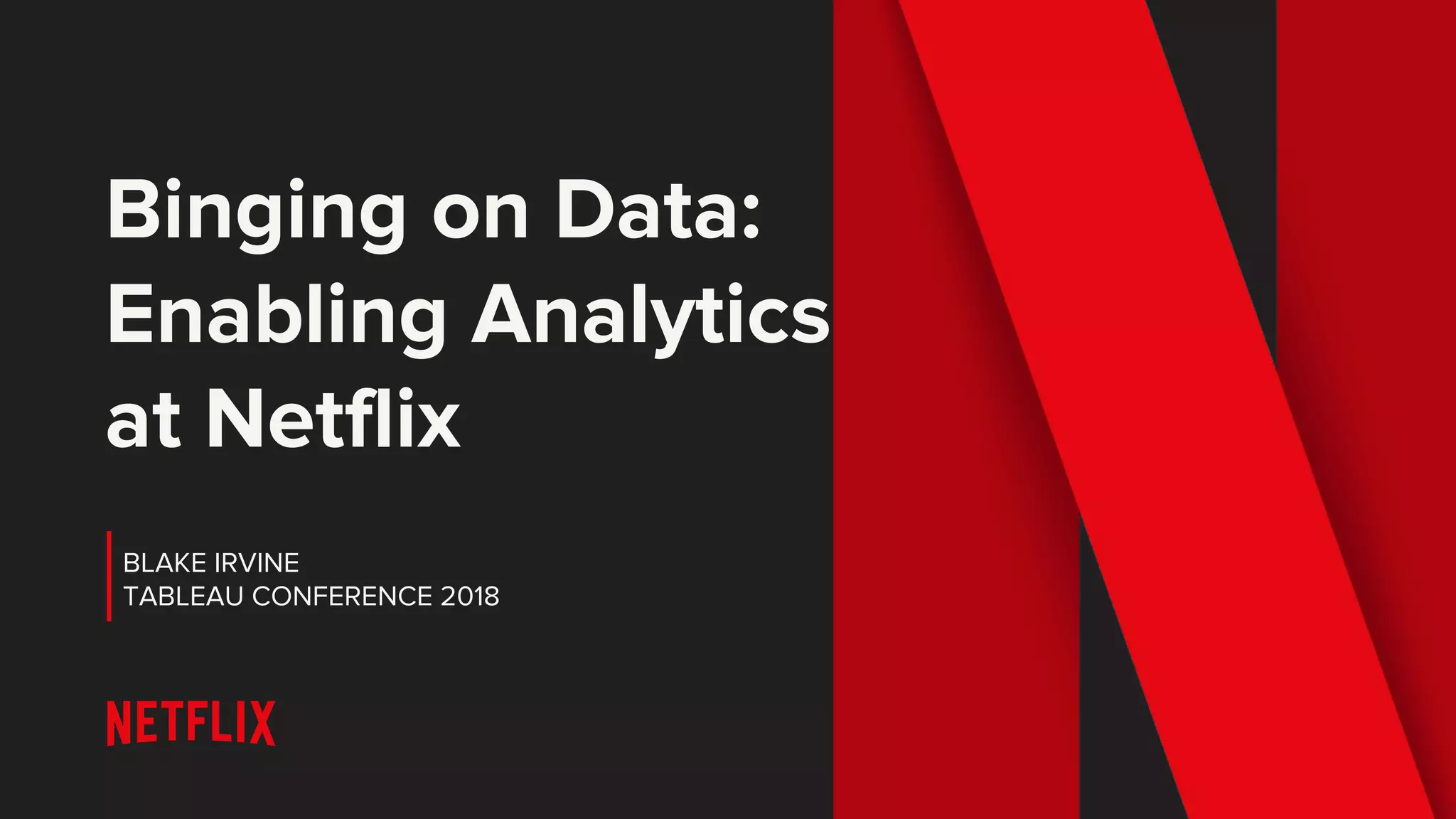 Blake Irvine's presentation at the Tableau Conference 2018 discusses how Netflix enables analytics across various departments, emphasizing the importance of data-driven decisions and A/B testing. The document outlines Netflix's analytics ecosystem, challenges related to data scale and lineage, and the usage of Tableau alongside their big data portal. It also mentions ongoing efforts to improve data reporting practices and explore new technologies like Apache Druid for better analytics performance.