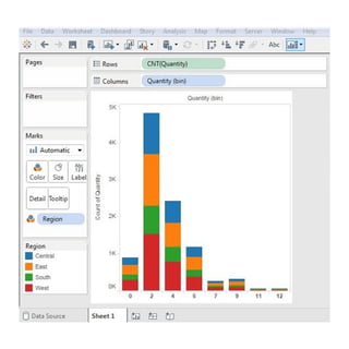 A histogram visualizes the distribution of a variable's values by grouping them into continuous ranges (bins) to show the frequency of occurrences. In Tableau, creating a histogram involves dragging a measure to the rows shelf and selecting the histogram chart option, which automatically buckets the data. Additional dimensions can be added for a stacked histogram, allowing for more detailed visual analysis across categories.
