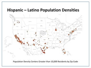 This document contains population density data for various racial and ethnic groups in the United States, including Hispanic/Latino, African American, Asian, Hawaiian/Pacific Islander, Native American/Indian, and Caucasian/White populations. For each group, it lists the population density centers with a minimum threshold of residents by zip code.