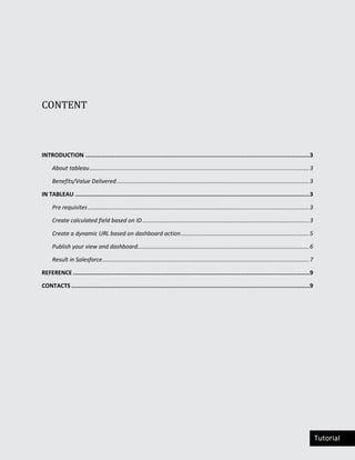 This tutorial demonstrates how to create dynamic links in Tableau that point to Salesforce records. It discusses integrating Tableau with Salesforce to allow users to leverage a transactional CRM solution alongside data visualization. The tutorial provides steps to create a calculated field in Tableau using the Salesforce record ID, build a dynamic URL action, publish the views and dashboard to Tableau Online, and embed the resulting dashboard in Salesforce.