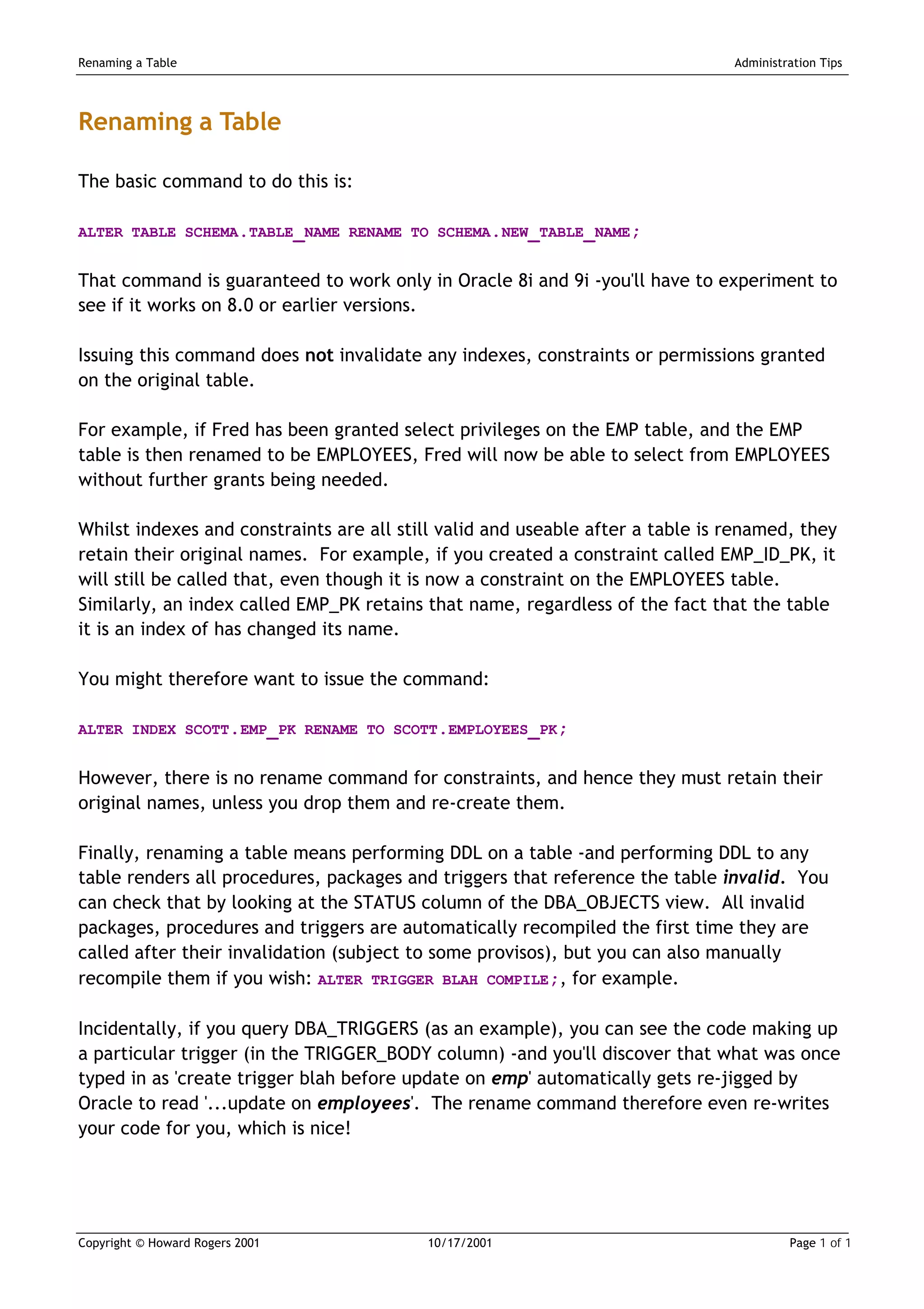 The document explains how to rename a table in Oracle using the command 'alter table schema.table_name rename to schema.new_table_name', which works primarily in versions 8i and 9i. Renaming a table does not affect existing indexes or constraints, but these retain their original names, and constraints cannot be renamed without being dropped and recreated. Additionally, renaming a table renders associated procedures, packages, and triggers invalid, but they can be recompiled automatically or manually.