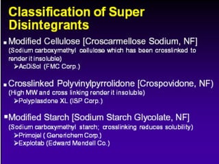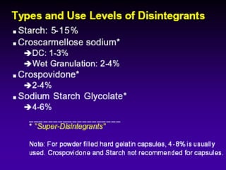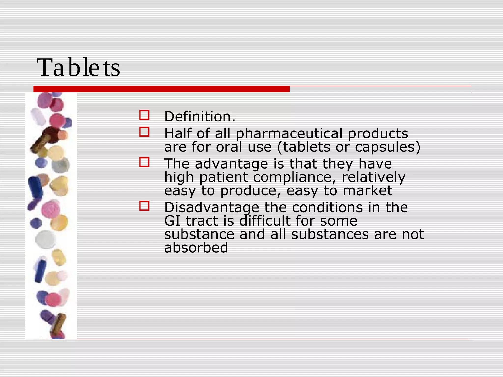 Tablets are one of the most common oral drug delivery forms, comprising around half of all pharmaceutical products. Tablets offer advantages like high patient compliance and ease of production and marketing. However, some substances may not be well absorbed in the gastrointestinal tract. Tablets are compressed dispersions of particles that come in various types depending on if they are taken intact or not. Their manufacture involves steps like raw material procurement, formulation, granulation, compression, coating and packaging. Granulation can improve properties like flow and compressibility and is usually done by wet or dry processes. Tablets contain active substances and excipients like fillers, disintegrants, binders, lubricants and coatings to provide the desired properties.