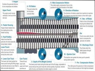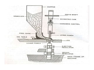 - Punches and dies come in different types depending on the tablet shape needed, such as round, oval, capsule, or irregular shapes.