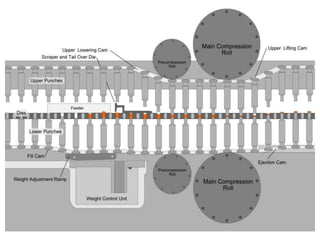 - Tablet compression machines use punches and dies to compress powder ingredients into tablets of precise shapes and sizes.