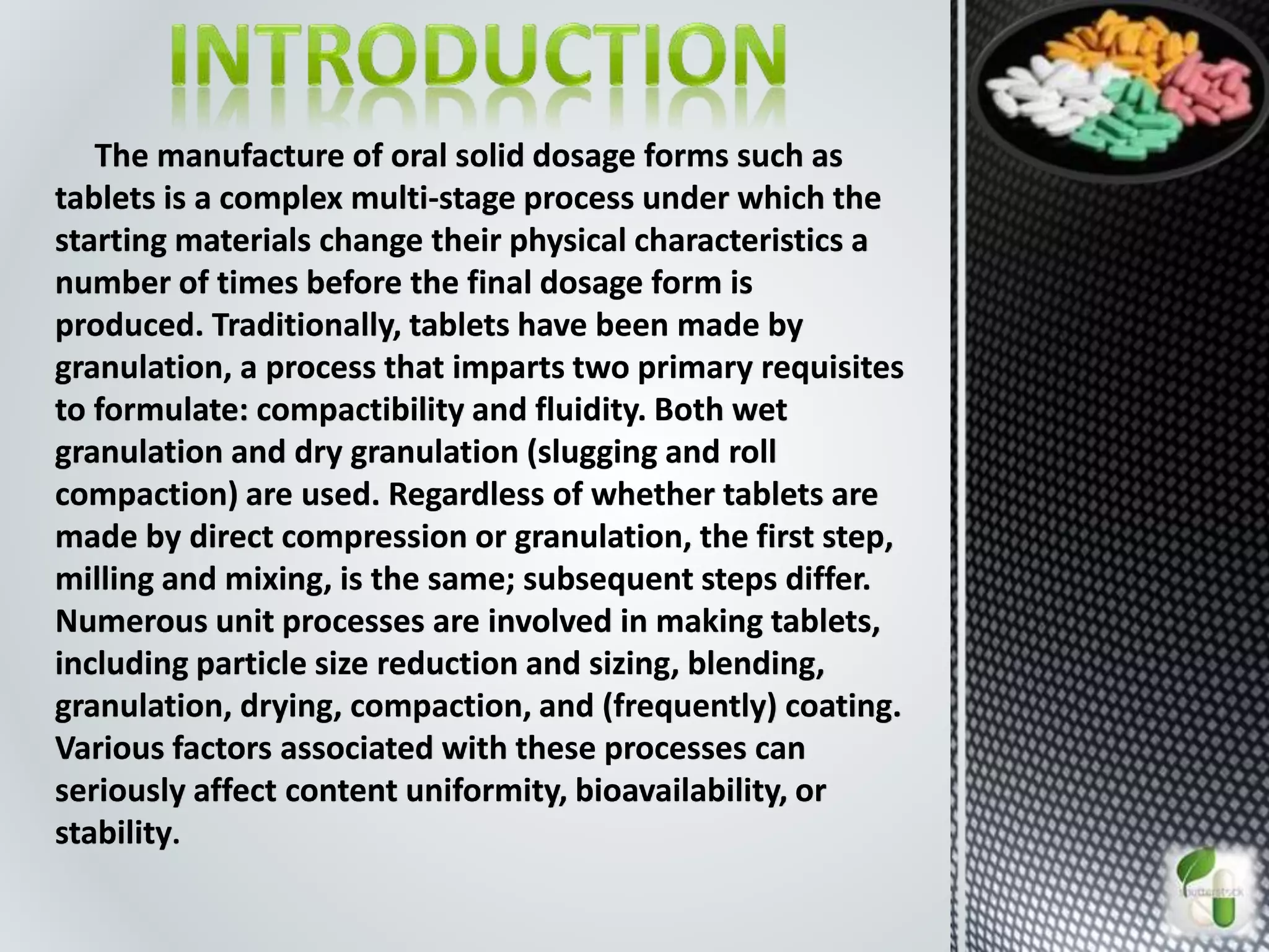 The document summarizes the key steps involved in manufacturing oral solid dosage forms like tablets. It involves size reduction of raw materials, blending, granulation, drying, lubrication, compression into tablets, coating if needed, and final packaging. Precise control of critical process parameters is required at each stage to ensure quality, bioavailability and stability of the final tablets. Granulation is an important step for uniform distribution of drugs in the blend and influences tableting process. Drying is also critical to control residual moisture. Compression forms the tablets and critical parameters like hardness and disintegration time need to be monitored.