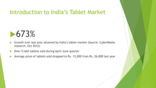 The document summarizes India's tablet market segmentation. It discusses the significant growth in tablet sales over the last year. It then covers the history and major players in the tablet market. Various segmentation strategies for tablets are presented, including demographic segmentation based on consumer vs business users, need-based segmentation, operating system-based segmentation, and feature-oriented segmentation. Price-based segmentation and geographic segmentation are also summarized. Current market share data for major brands in India is provided. The conclusion discusses the huge opportunity for marketers in India given the large number of potential customers as internet and technology adoption increases.