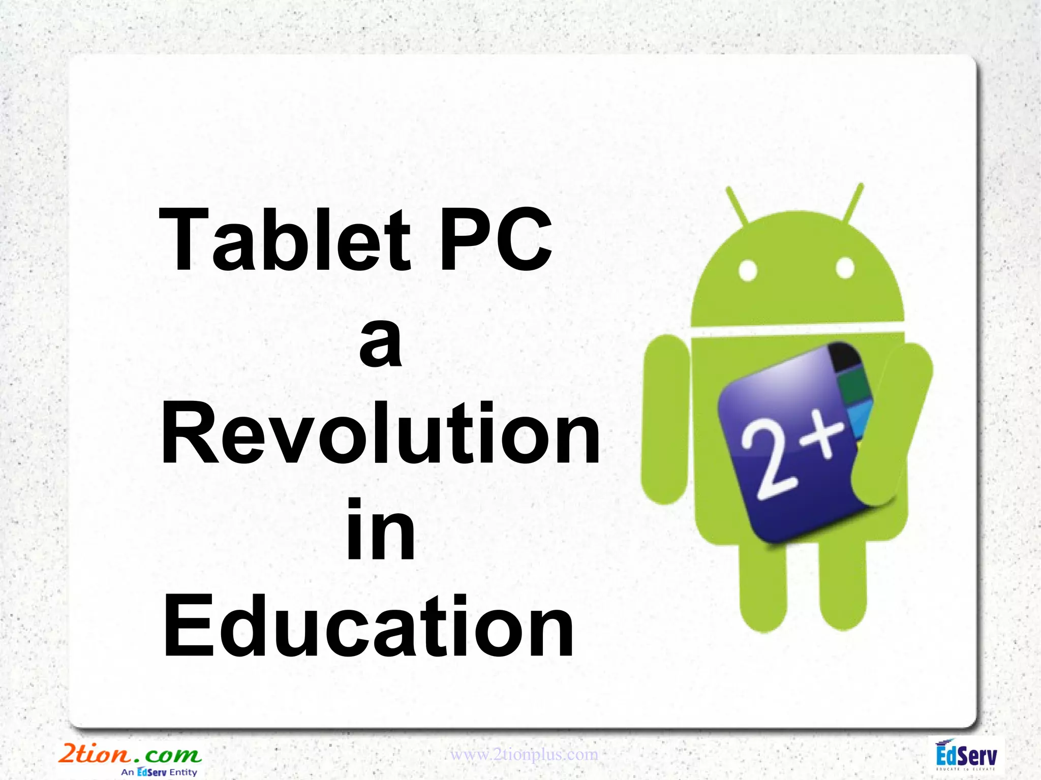 Tablet devices are becoming more prevalent in education in India. The government plans to distribute 22 crore Aakash tablets to students in the future. Tablet learning allows students to access educational resources anywhere and anytime through mobile devices. Features of the 2tionPlus app for Android tablets include access to expert tutors, collaborative learning tools like video lectures and online whiteboards, and games like Sudoku and chess to supplement the learning experience.