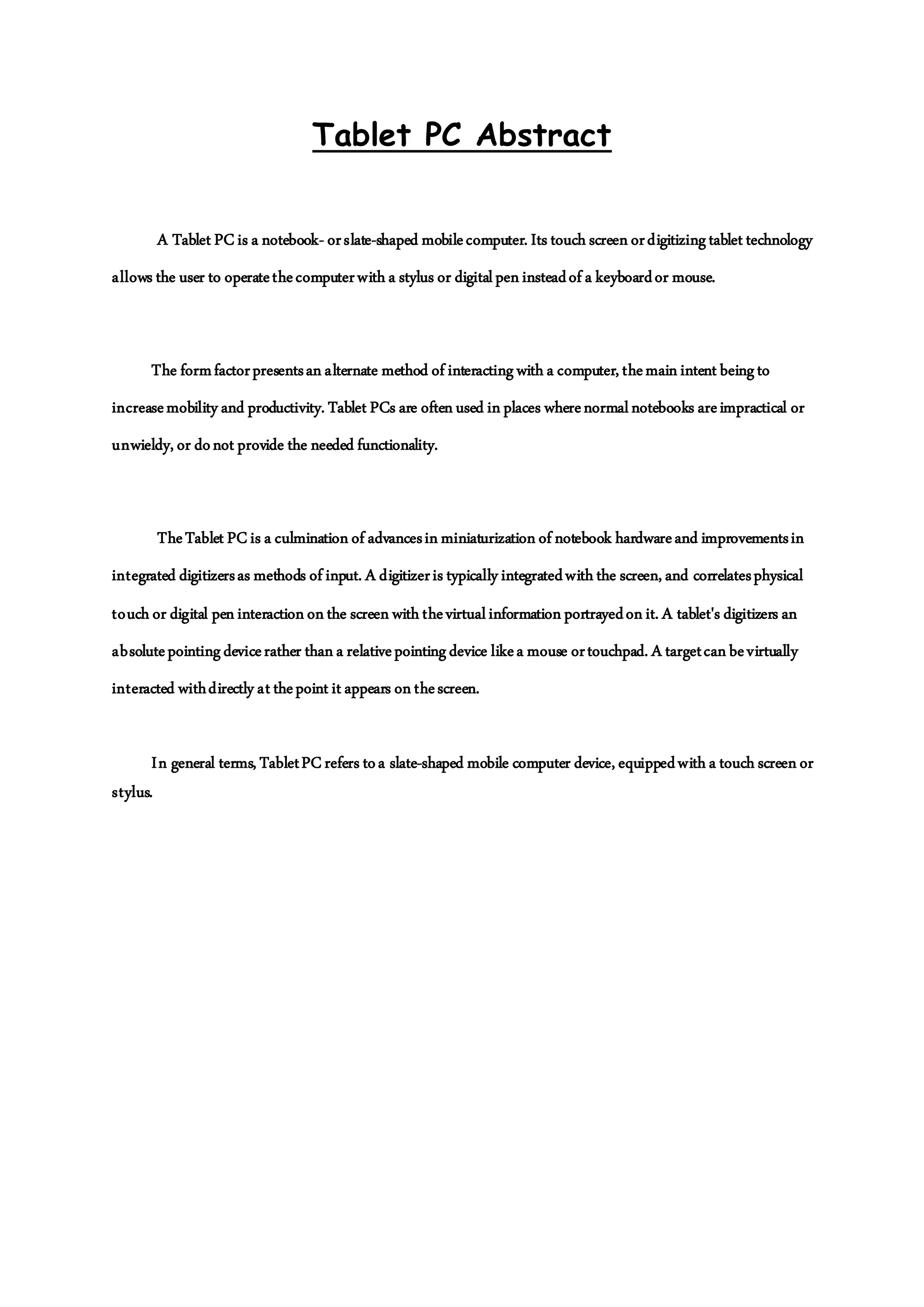 A Tablet PC is a mobile computer that can be used with a stylus or digital pen instead of a keyboard or mouse. It has a touch screen or digitizing tablet that allows users to directly interact with content on the screen. Tablet PCs aim to increase mobility and productivity by providing an alternative to traditional notebooks in situations where notebooks are impractical or unwieldy. They integrate advances in miniaturized notebook components with digitizers that correlate physical touch or pen inputs on the screen with the virtual information displayed.
