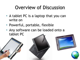 The document discusses the use of tablet PCs in higher education, highlighting their portability and flexible software capabilities alongside potential drawbacks like cost and lack of certain hardware. It covers their applications in specific fields like archaeology, geoscience, and ecology, with defined objectives for teaching and research. Additionally, it mentions considerations for using tablets in fieldwork, including weather resistance and power management.